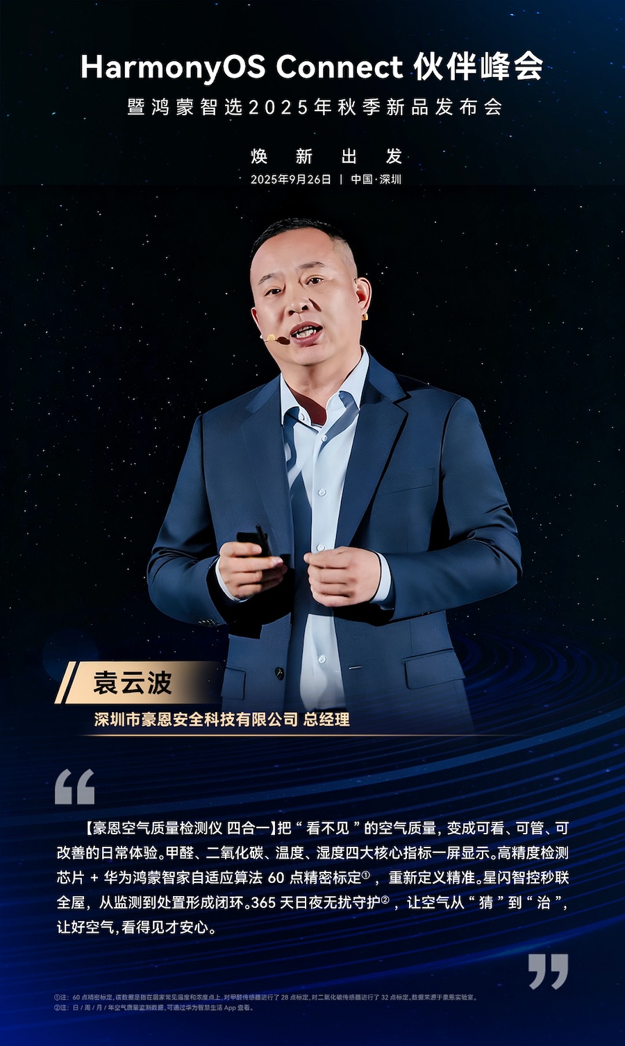 隨著公眾對健康生活與智能家居的關(guān)注不斷提升,空氣質(zhì)量監(jiān)測類產(chǎn)品正逐漸成為智慧家庭的重要組成部分。豪恩與鴻蒙智選的深度合作,代表著行業(yè)對空氣健康管理的重視,也標志著豪恩在智能家居生態(tài)中的全新突破。
