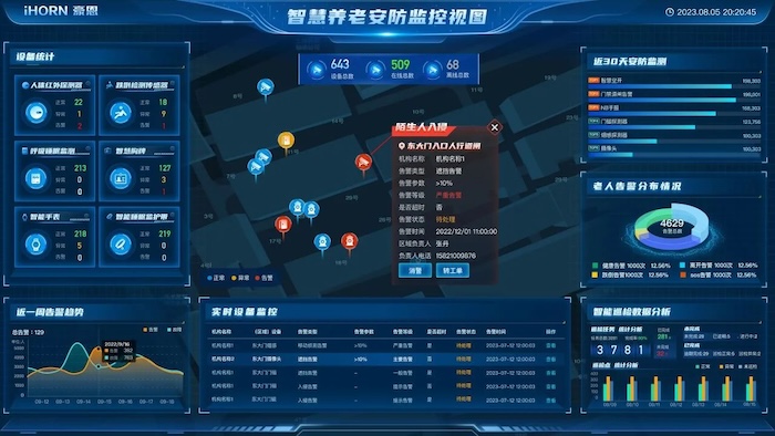Safety monitoring equipment (smoke alarm, gas alarm, fall detector, human body mobile detector, door and window sensor, water immersion sensor, etc.) can be monitored online 24 hours. Once abnormal conditions are found, real-time alarm and the alarm information will be transmitted to the supervision platform. The organization staff can quickly locate the location of the alarm room, grasp the golden rescue time;