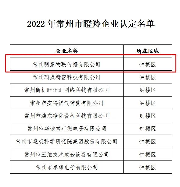 中安科子公司常州明景物聯(lián)傳感有限公司(以下簡稱明景)榜上有名,榮獲“2022年常州市瞪羚企業(yè)”認(rèn)定。
