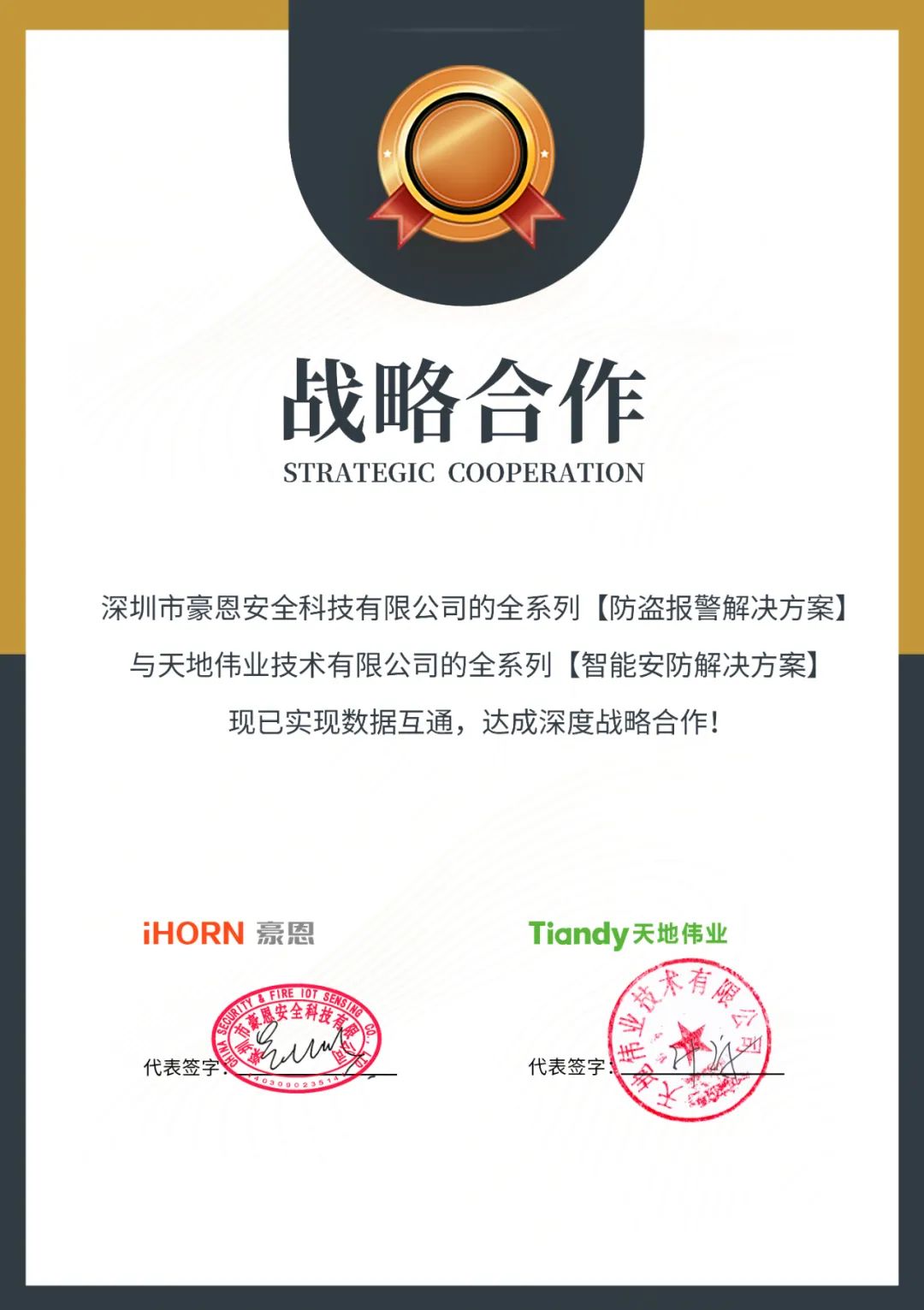 近日,中安科子公司 —— 深圳市豪恩安全科技有限公司(以下簡稱“豪恩”)的全系列防盜報警解決方案與天地偉業(yè)技術(shù)有限公司(以下簡稱“天地偉業(yè)”)的全系列智能安防解決方案已實現(xiàn)數(shù)據(jù)互通,達成深度戰(zhàn)略合作!