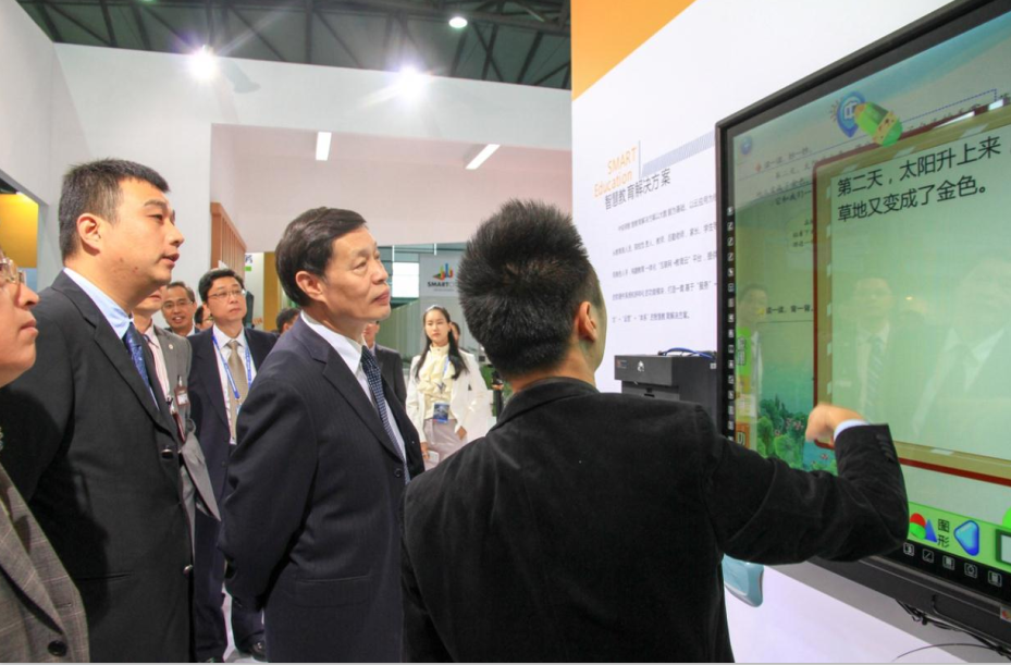 中安科股份副董事長兼總裁周俠(左一)陪同住建部總工程師陳宜明(左二)參觀中安消智慧教育解決方案展臺