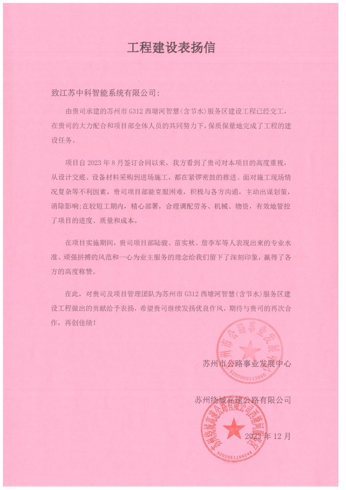 近日,蘇州市公路事業(yè)發(fā)展中心和蘇州繞城高速公路給中安科子公司中科智能發(fā)來聯(lián)名表揚信,對中科智能在“蘇州市G312西塘河智慧(含節(jié)水)服務區(qū)建設(shè)工程G312-ZHFWQ標段”項目中的整體工作予以認可,尤其是對項目部全體成員在項目實施過程中專業(yè)水準、頑強拼搏的風范和一心為業(yè)主服務的理念表示稱贊。