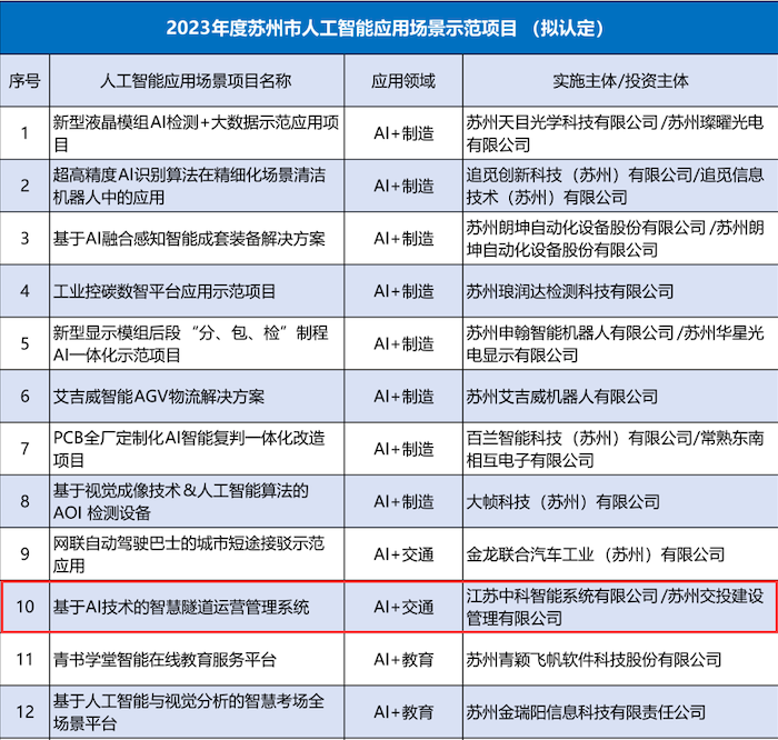 近日,2023年度蘇州市人工智能應(yīng)用場(chǎng)景示范項(xiàng)目名單公布,中安科子公司中科智能與蘇州交投建設(shè)管理有限公司聯(lián)合申報(bào)的“基于AI技術(shù)的智慧隧道運(yùn)營(yíng)管理系統(tǒng)”通過(guò)評(píng)審,成功入選人工智能應(yīng)用場(chǎng)景示范項(xiàng)目。