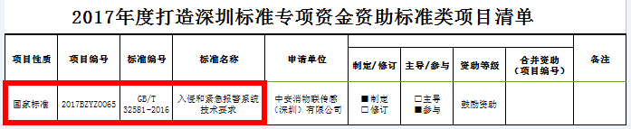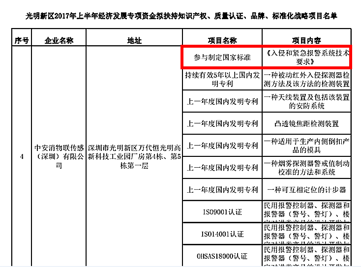 作為國家級高新技術(shù)企業(yè)及深圳市戰(zhàn)略性新興企業(yè),中安消物聯(lián)傳感(深圳)有限公司(原深圳市豪恩安全科技有限公司)高度重視標準化、體系化建設。因在國家標準制定方面所取得的突出成果,中安消物聯(lián)傳感獲得2017年度打造深圳標準和光明新區(qū)2017年上半年經(jīng)濟發(fā)展兩級政府專項資金的支持。