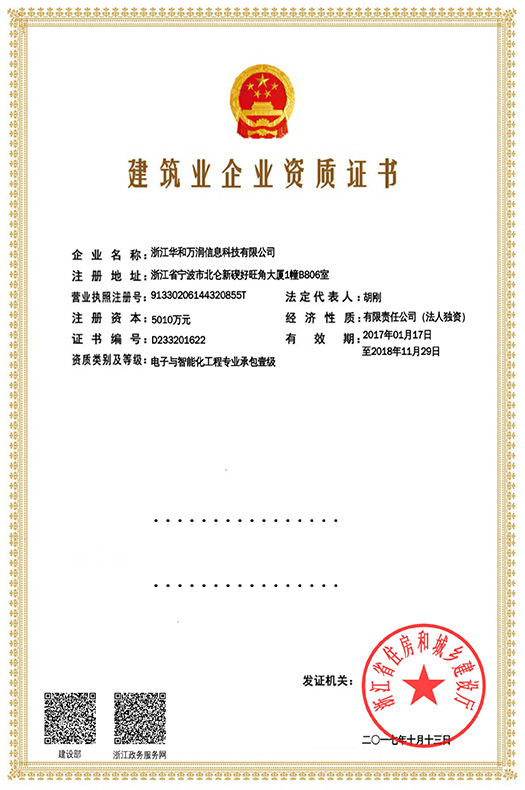 2017年10月13日,中安科股份成員企業(yè)浙江華和萬(wàn)潤(rùn)信息科技有限公司(以下稱華和萬(wàn)潤(rùn)),經(jīng)浙江省住房和城鄉(xiāng)建設(shè)廳核準(zhǔn)和近一年的嚴(yán)格審核與評(píng)估,憑借自身強(qiáng)大的技術(shù)實(shí)力和優(yōu)秀的業(yè)績(jī)背景,順利通過(guò)評(píng)審,成為電子與智能化工程專業(yè)承包一級(jí)資質(zhì)企業(yè)。