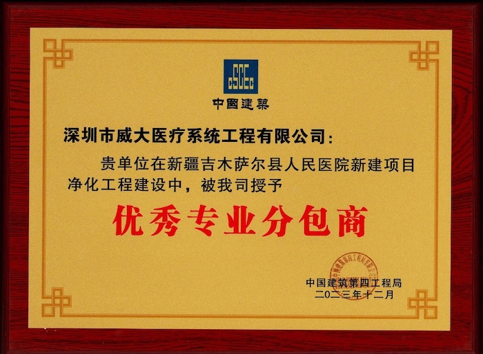 近日,中安科子公司深圳市威大醫(yī)療系統(tǒng)工程有限公司在承建的新疆吉木薩爾縣人民醫(yī)院新建項目凈化工程中,被總包單位中國建筑第四工程局授予“優(yōu)秀專業(yè)分包商”的榮譽(yù)稱號;同時,公司駐新疆吉木薩爾縣人民醫(yī)院項目部,也在2023年度醫(yī)療凈化工程項目中,被評為“優(yōu)秀管理團(tuán)隊”。