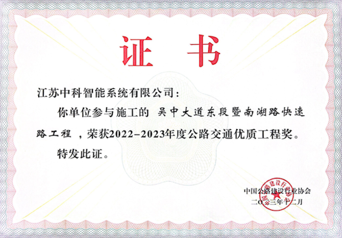 2024年1月13日,第五屆公路建設(shè)高質(zhì)量大會(huì)暨公路交通優(yōu)質(zhì)工程獎(jiǎng)表彰大會(huì)在湖北武漢舉行,由中安科子公司江蘇中科智能系統(tǒng)有限公司(以下簡(jiǎn)稱“中科智能”)參建的吳中大道東段暨南湖路快速路工程,獲評(píng)2022-2023年度公路交通優(yōu)質(zhì)工程,中科智能作為獲獎(jiǎng)工程代表之一參加了表彰大會(huì)。