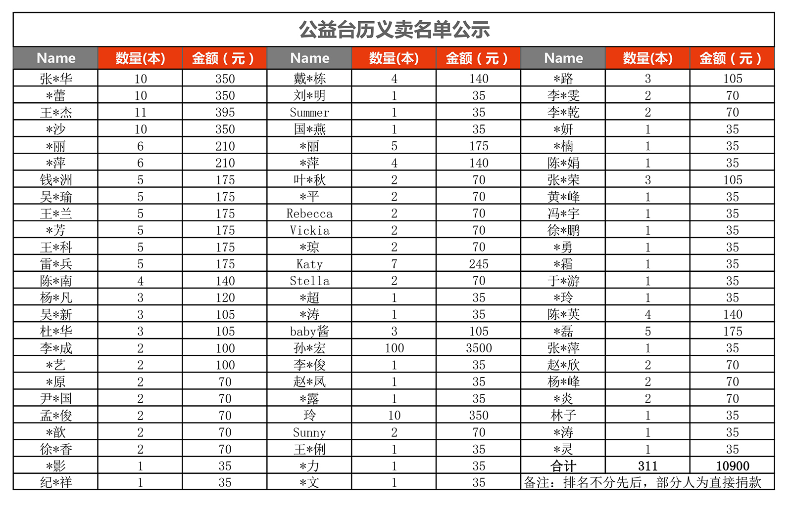 在此,我們衷心感謝感謝所有參與者,您的愛心讓“星星兒童”銘記于心。據(jù)統(tǒng)計(jì),線上線下共有73名愛心人士購(gòu)買臺(tái)歷,認(rèn)購(gòu)數(shù)量311本,捐款金額10900元,下表是公示記錄: