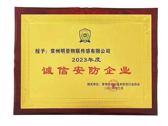 中安科子公司常州明景物聯(lián)傳感有限公司榮獲“2023年度誠信安防企業(yè)”及"2023年度常州安防行業(yè)優(yōu)秀安防產品”榮譽稱號。