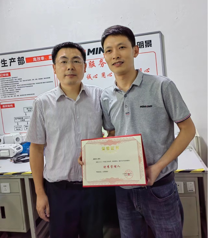 “優(yōu)秀管理人”——朱傳飛,生產(chǎn)部經(jīng)理兼售后服務(wù)經(jīng)理,作為生產(chǎn)管理第一責(zé)任人,2021年通過帶領(lǐng)技術(shù)骨干調(diào)整工序、優(yōu)化工藝流程(攻關(guān)改進92項)等,極大的提高了產(chǎn)能,與上一年相比,入庫產(chǎn)量提升18.7%、入庫產(chǎn)值提升36%;帶領(lǐng)團隊的售后團隊年度維修及時率96%、維修總量2113件、維修質(zhì)量100%、零投訴、售后服務(wù)滿意度100%,并創(chuàng)造了二次銷售與盈利;作為生產(chǎn)安全第一責(zé)任人,定期組織宣導(dǎo)安全教育,做到全年生產(chǎn)財產(chǎn)、人身安全零事故。